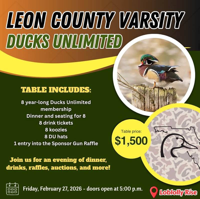 The Leon County Varsity Ducks Unlimited Chapter would like to invite you to our 8th Dinner Banquet. Save the date 2/27/2026. The location will be Loblolly Rise. Doors will open at 6:00 PM. We will have a special Happy Hour for our Sponsors at 5:30 PM This group of girls and guys have worked hard in raising money for wetland conservation. Come out and support the one of the Top Varsity Chapters in the Country. We will have a top drawer live auction and a first class raffle that you do not want to miss. Make sure you get your tickets today.