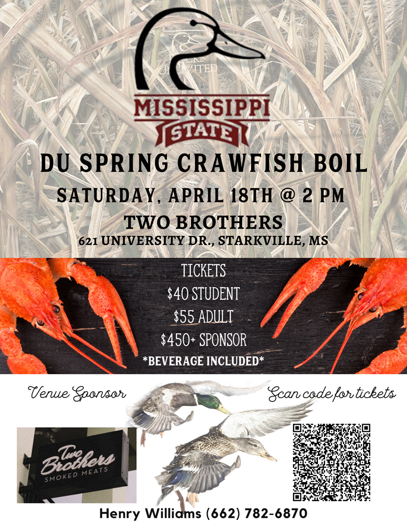 Come out on Saturday, April 18th and join the Bulldog Chapter of Ducks Unlimited at their 15th Annual Crawfish Boil to be held at Two Brothers. Doors will open at 2:00 p.m.