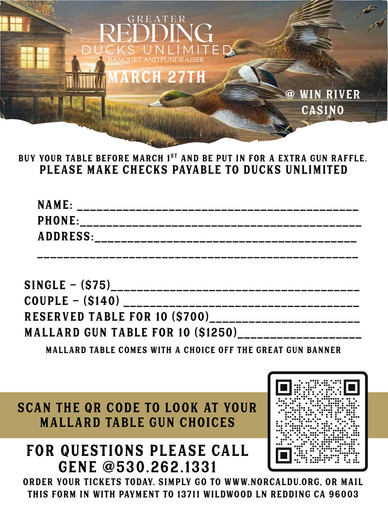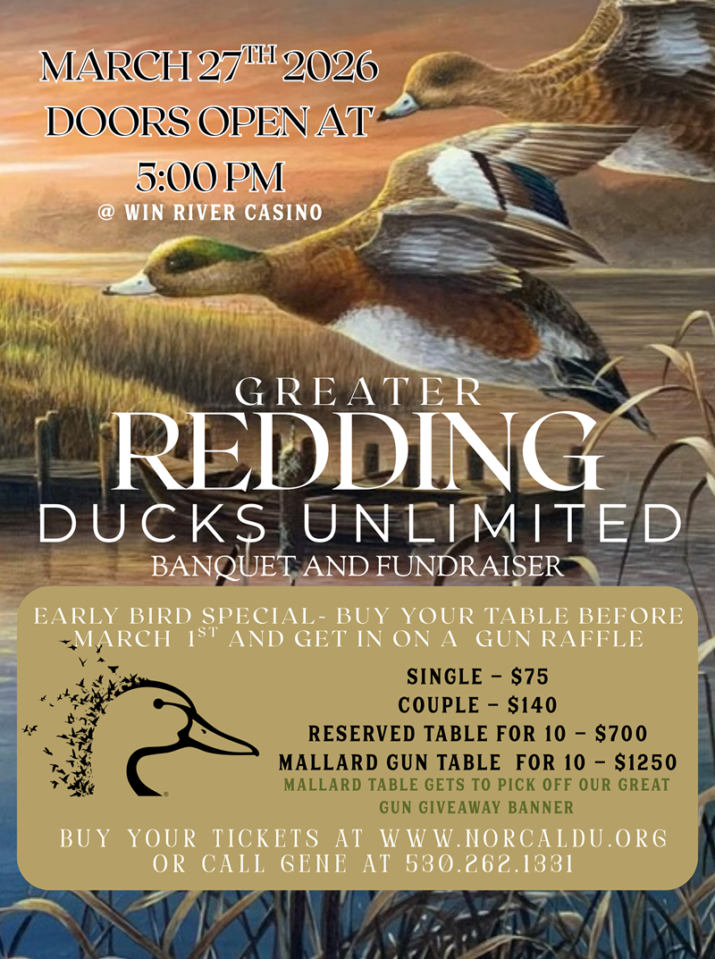 Ducks Unlimited Redding Chapter is happy to host our annual banquet in Redding California at Win River Casino. Come out and join us for an amazing night of conservation with tons of prizes to win and a chance to make your mark on ensuring waterfowl fills the skies today, tomorrow and forever.