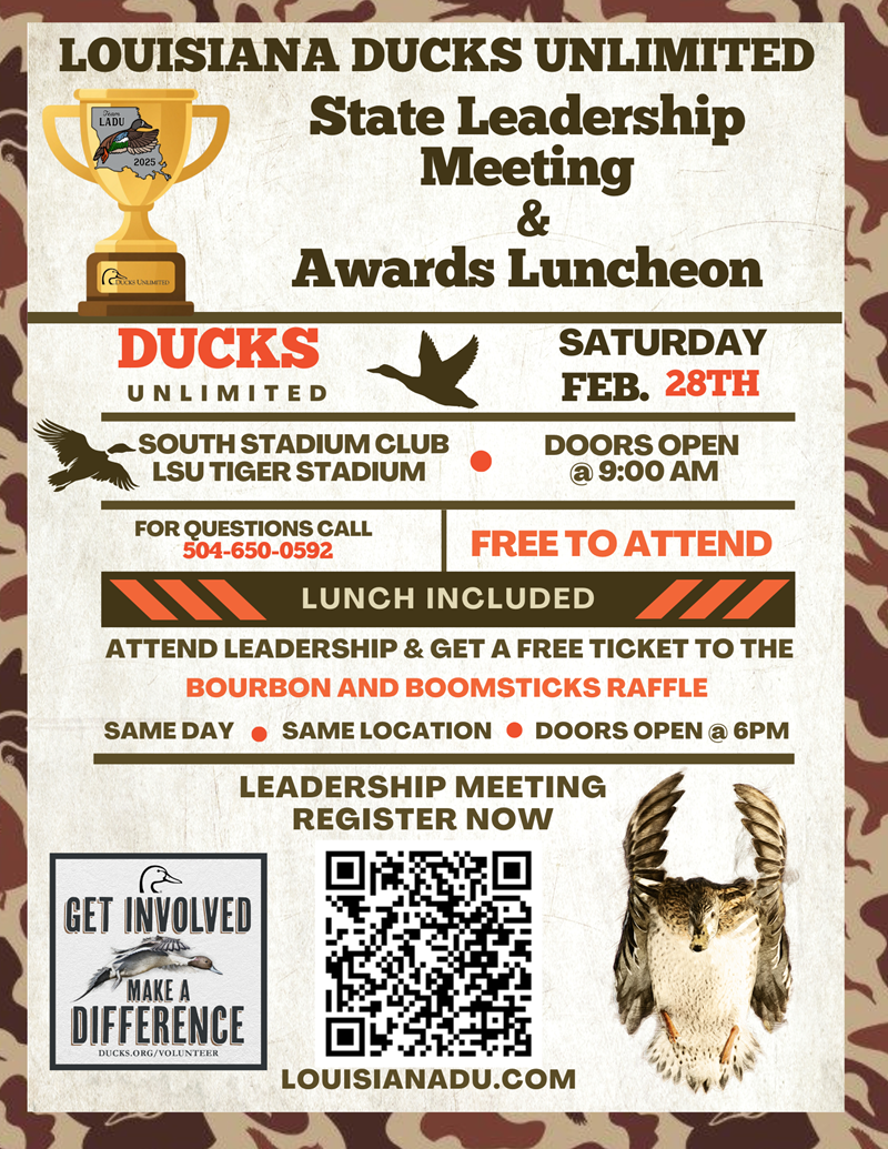For those who attand Leadership Meeting, we will give a free ticket to attend the Ducks Unlimited Ultimate Allocated Bourbon & Boomsticks Raffle taking place later that night. Details for that event can be found by clicking the link below.