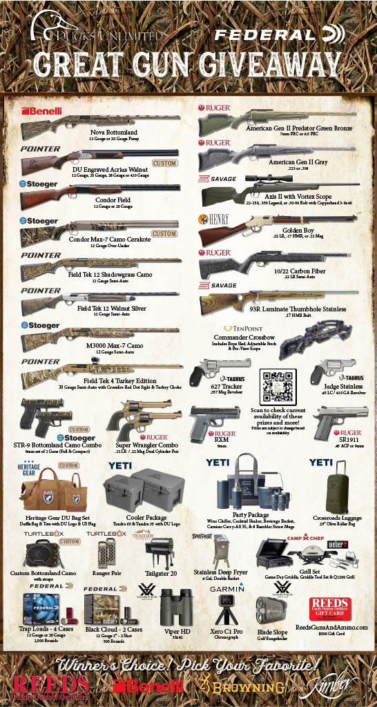 Wood Duck Sponsor Table ($1500) - Great Gun Table! Includes reserved seating for 8 people at the event, one 2026 DU Bronze Sponsor package for the buyer, 7 annual DU memberships, and your choice of 1 item from the DU Great Gun & Gear Banner! Scan QR code below for a current list of items available.