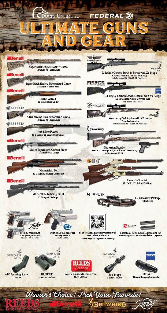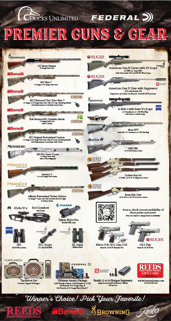 Mallard Sponsor Table ($4000) - Premier Guns & Gear! Includes premium reserved seating for 8 people at the event, one 2026 DU Gold Sponsor package for the buyer ($1000 value), 7 annual DU memberships, your choice of 1 item from the DU Premier Gun Banner! Scan QR code below for a current list of items available.