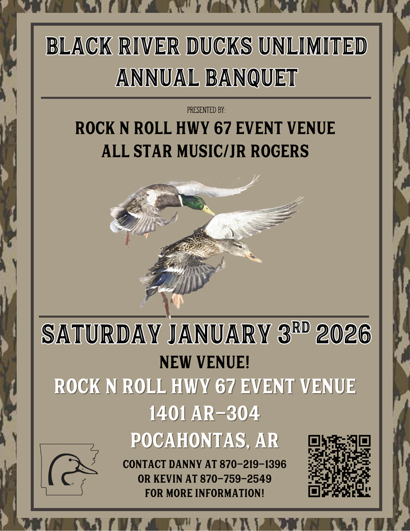 For more information on the banquet, or to become a volunteer on the Black River DU chapter, contact Danny at 870-219-1396 or Kevin at 870-759-2549.