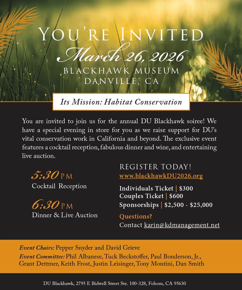 You are invited to join us for the 14th annual DU Blackhawk Gala! We have a special evening in store for you as we raise support for DU’s vital conservation work in California and beyond. The exclusive event features a cocktail reception, fabulous dinner and wine, and entertaining live auction.