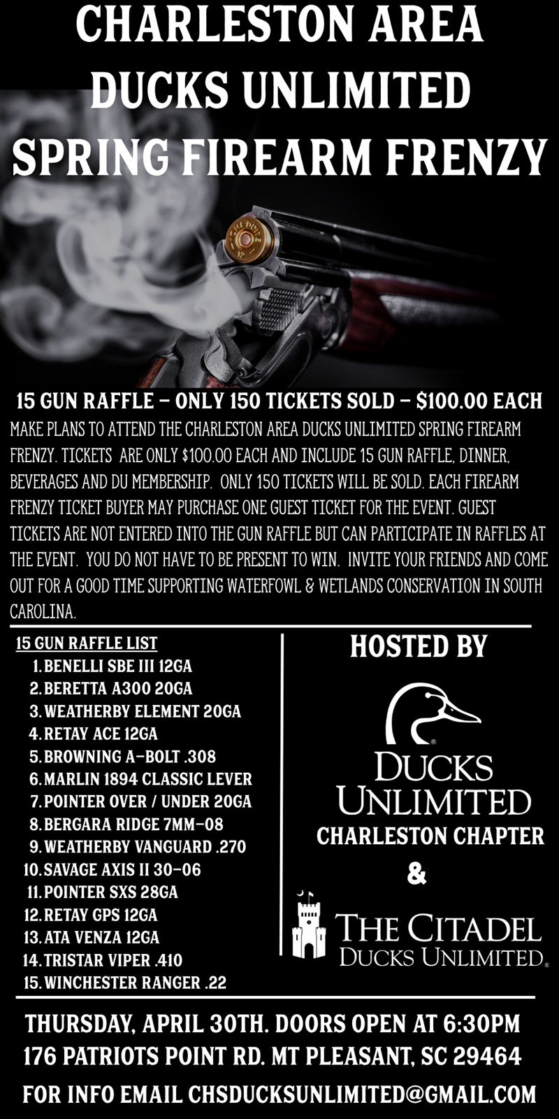 Make plans to attend Charleston Area Ducks Unlimited Spring Firearm Frenzy! Tickets are only $100.00 and enter you into our 15 gun raffle. Your ticket also includes Dinner, Beer, Wine and Soft Drinks. Only 150 tickets will be sold for this event giving all ticket holders a true 1 in 10 chance of winning a new firearm. Your ticket also gives you the opportunity to invite one guest for an additional $35.00. Guest tickets are not entered into the Gun Raffle but can participate in other raffles held during the event. Invite your friends and come out for a good time supporting a great cause!