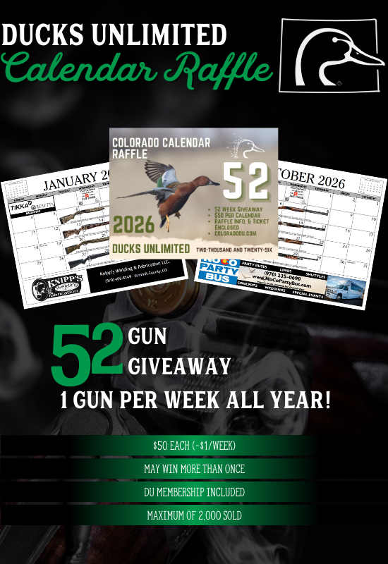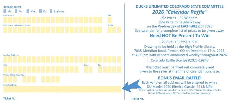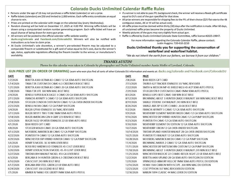 - Winners will be announced weekly on facebook.com/coloradodu and at https://www.ducks.org/colorado/colorado-du-calendar-gun-giveaway. Winners are posted by EOD each Wednesday and winners contacted directly thereafter with instructions for receiving their prize. Winners will need photo ID to claim prizes.