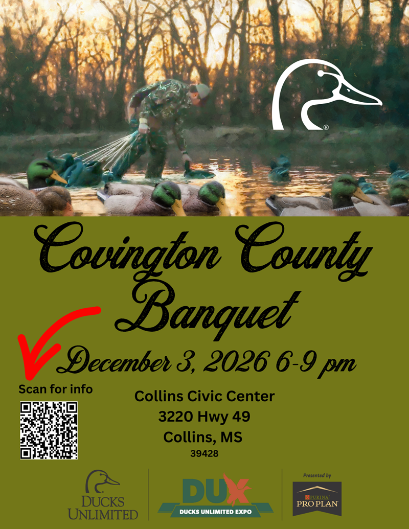 Please make plans to attend the Covington County Chapter of Ducks Unlimited Conservation Dinner and Fundraiser on Thursday December 3 , 2025 from 6 pm to 9 pm. Family friendly event packed with good food and fellowship. Sponsor today and "SAVE an ACRE" of wetlands.