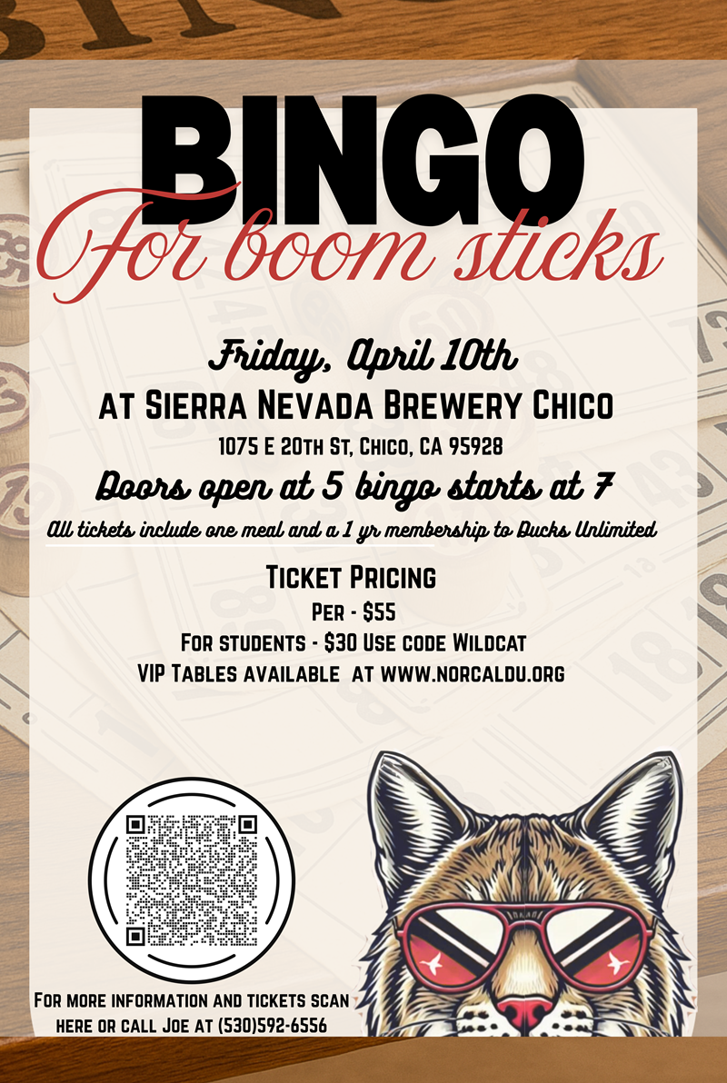 Chico State Chapter of Ducks Unlimited is happy to present Bingo for Boomsticks at Sierra Nevada's Big room. Come out and every round you will have the chance to win a firearm. Bingo Cards are additional to entry and we will play 11 rounds. Bingo Cards will be purchased at the event and prices are listed below.