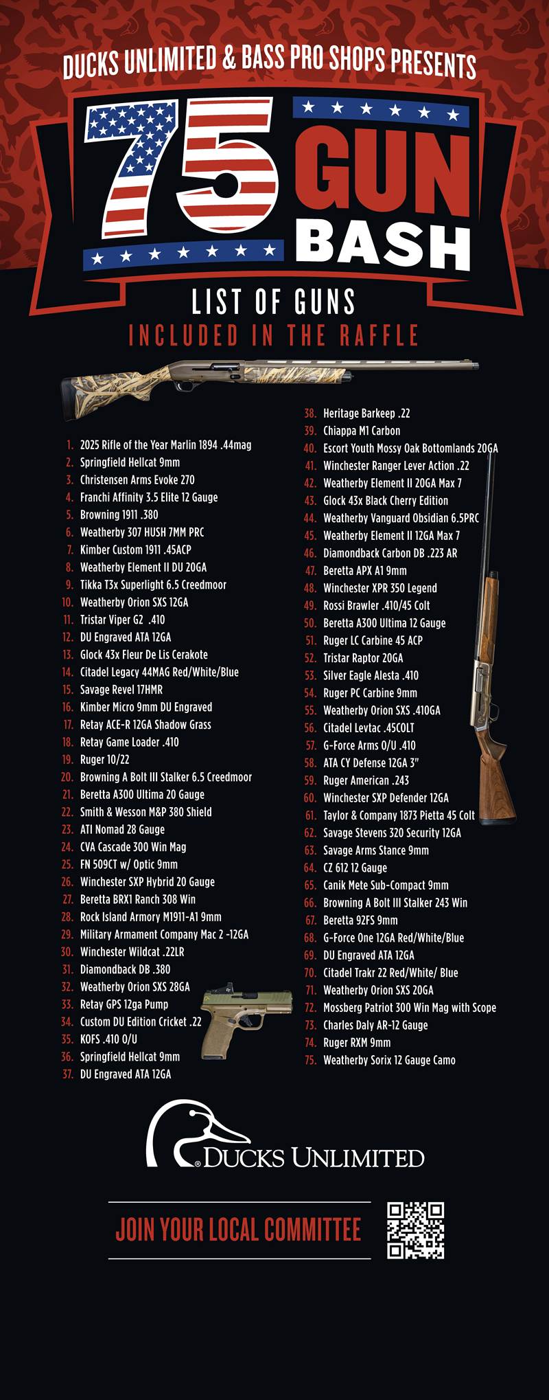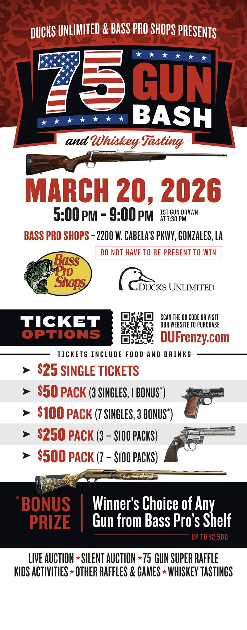 Ducks Unlimited's 75 Firearm Gun Bash, Whiskey Tasting and Banquet at Bass Pro Shop- Gonzales