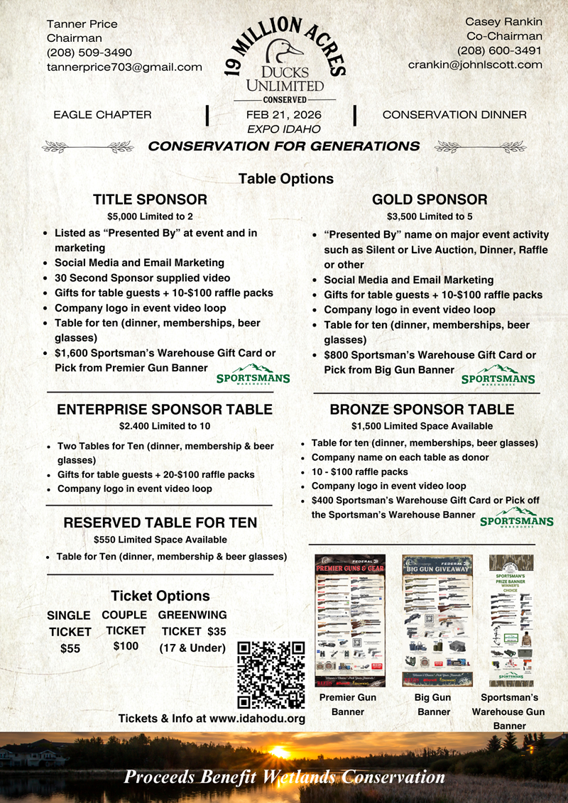 Join us a our new venue, Expo Idaho, for a fun evening with huge raffles, lots of auction items and chances to win. BBQ dinner provided by Grubbin BBQ. Your tickets include bottomless beer, dinner, a $35 DU membership, and the door prize drawing. Check out our new table and sponsor options for you to invite your friends or clients and have fun together. SWAG BAG RAFFLE - Very limited with only 40 available. For only $400 you will receive a bag of Swag, a $500 raffle pack, and a 1-in-40 chance to win your choice from the DU Premier Gun Banner. Limited to the first 40 sold. For tickets click on the Tickets link above. For questions or if you can help us plan this fun event call Tanner at 208-509-3490.