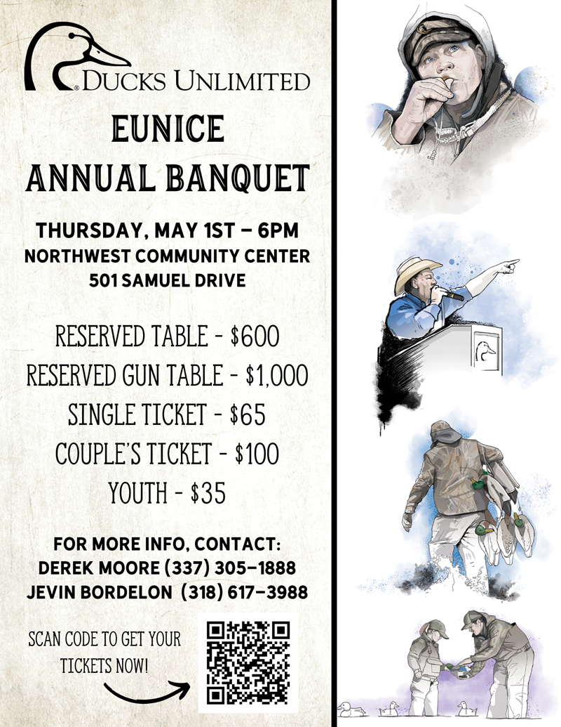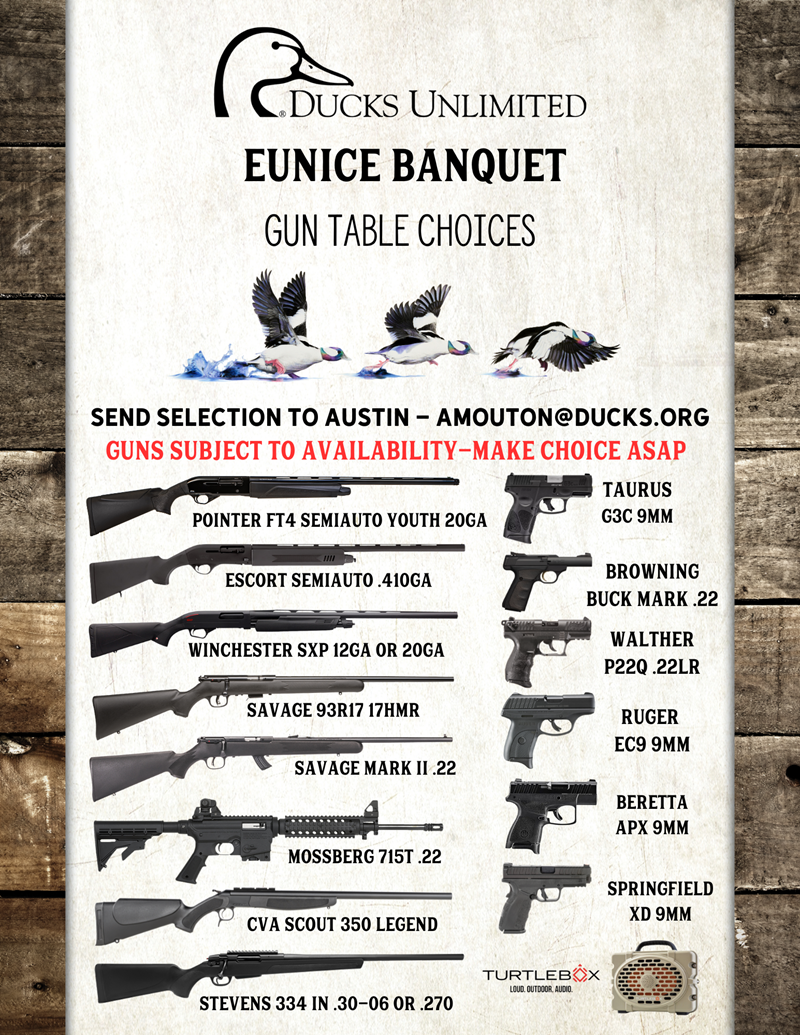 Join us for our Annual Eunice DU Banquet! We will have plenty of raffles and games, along with a silent and live auction of great guns and exclusive DU merchandise! Food and drinks for the evening are provided along with your annual DU membership!