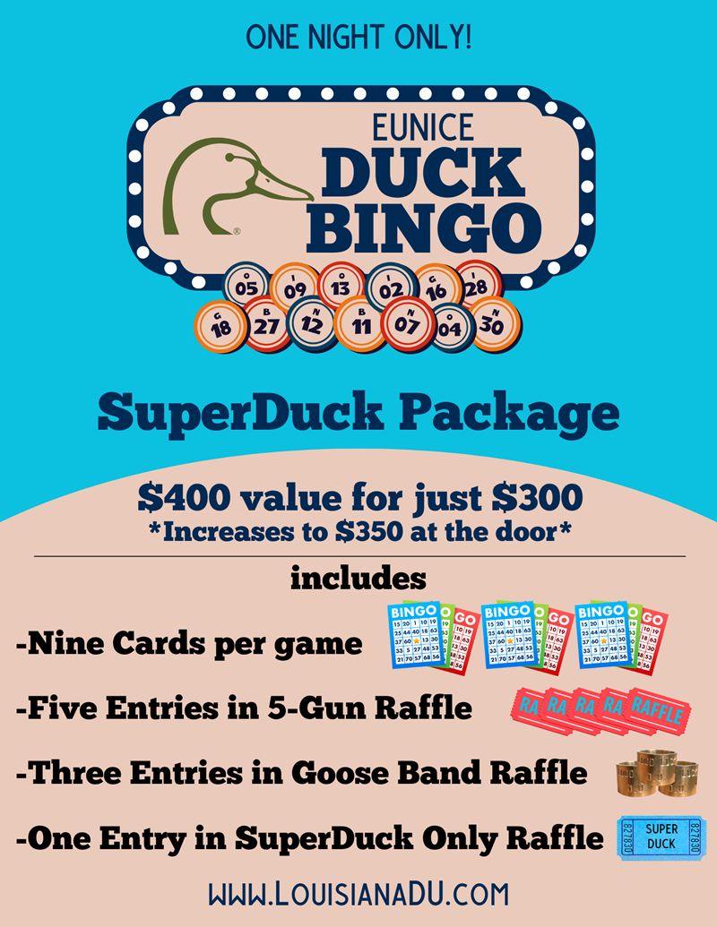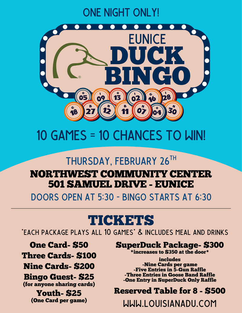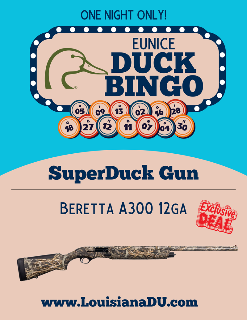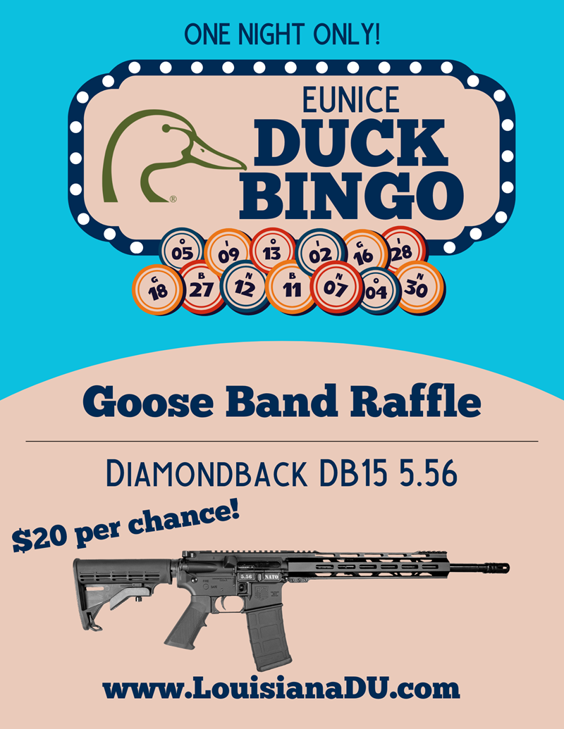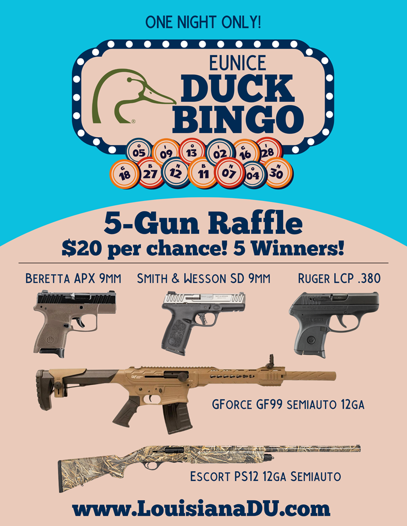 Come out to Eunice Duck Bingo! 10 Games of bingo for guns with raffles for even more guns!