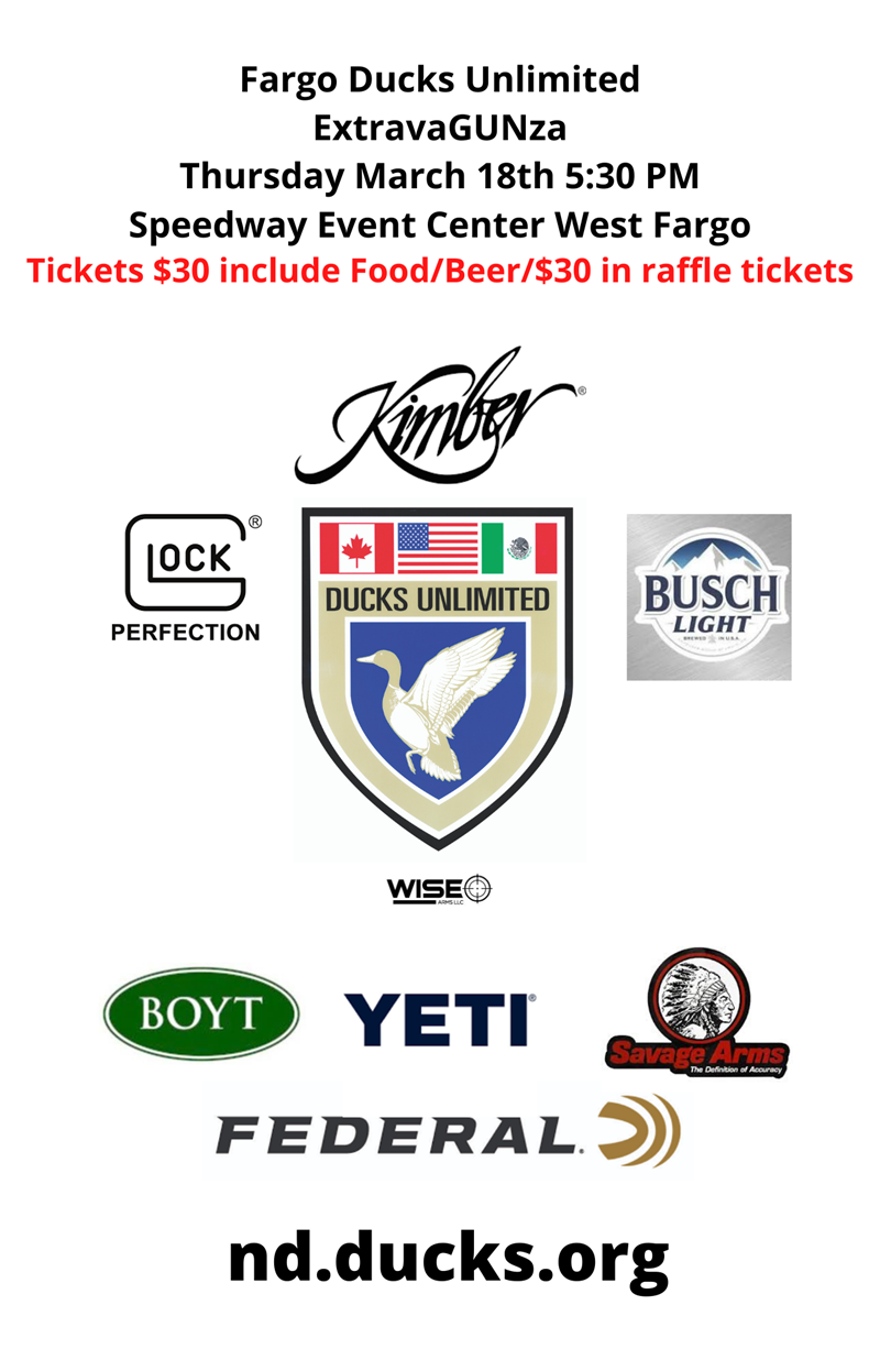 Join the Fargo area chapter of Ducks Unlimited for a fun night of raffles and games for Guns, Ammo, Outdoor items & more. With your ticket you will get food, free beer and $30 in free raffle tickets!