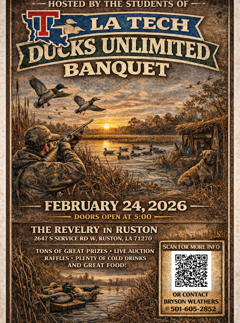Come join the LA Tech DU Chapter for their annual banquet! A great group of young people have gotten together and revived the LA Tech Ducks Unlimited Chapter, and this is going to be one you don't want to miss! Tons of great prizes, raffles, live auction, incredible food and fun for all plus the new 2026 DU Merch!