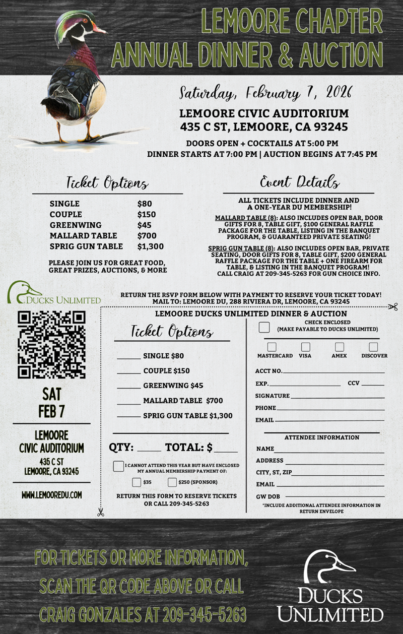 Join us in Lemoore & support conservation at this wonderful DU event! Food, auctions, prizes & MORE