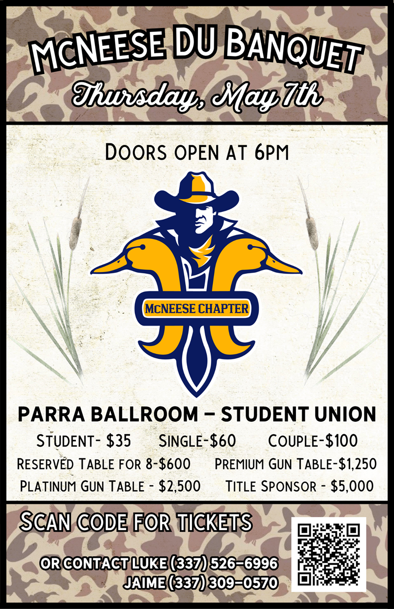 Join us for our annual Spring Banquet! Help your local university chapter reach All-American status! We'll have great food, a Live & Silent Auction, and plenty of great raffles to raise money for waterfowl and wetlands conservation!