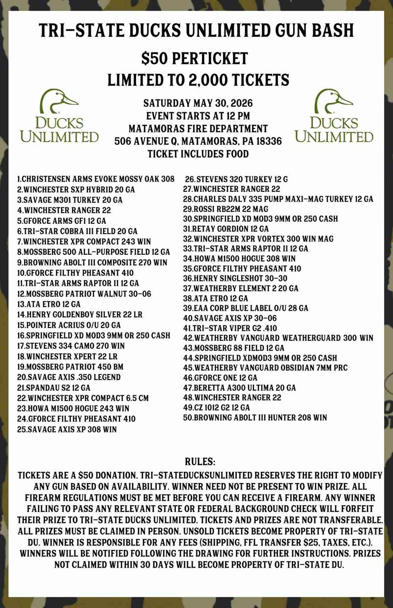 New Jersey Ducks Unlimited Tri-State Gun Bash - 50 Gun Raffle !!