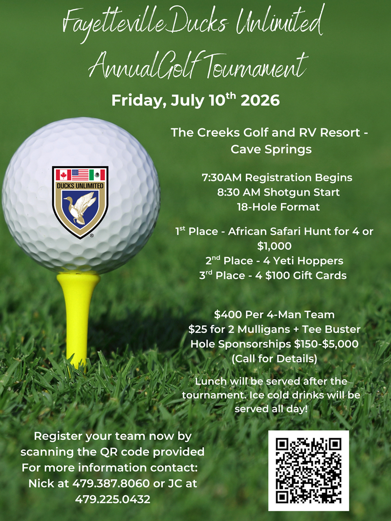 For more information on the tournament, or to become a volunteer on the Northwest Arkansas DU chapter, please contact Nick at 479-387-8060 or JC at 479-225-0432.