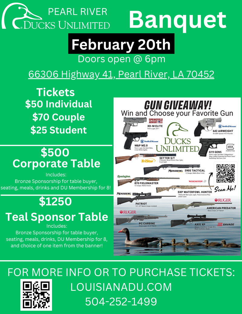 Come join the Pearl River Chapter of Ducks Unlimited as they hold their Annual Banquet on Friday, Feb. 20th. Doors will open at 6:00 p.m.