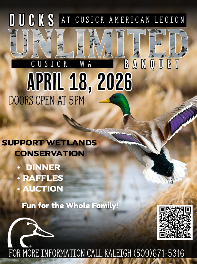 The Pend Oreille chapter of Ducks Unlimited is pleased to announce their annual banquet is coming up on April 18! Please come support our mission of wetlands conservation with our family-friendly evening of great food, cold drinks, raffles, games, a silent and live auction, and lot of fun! Get your tickets before they sell out!