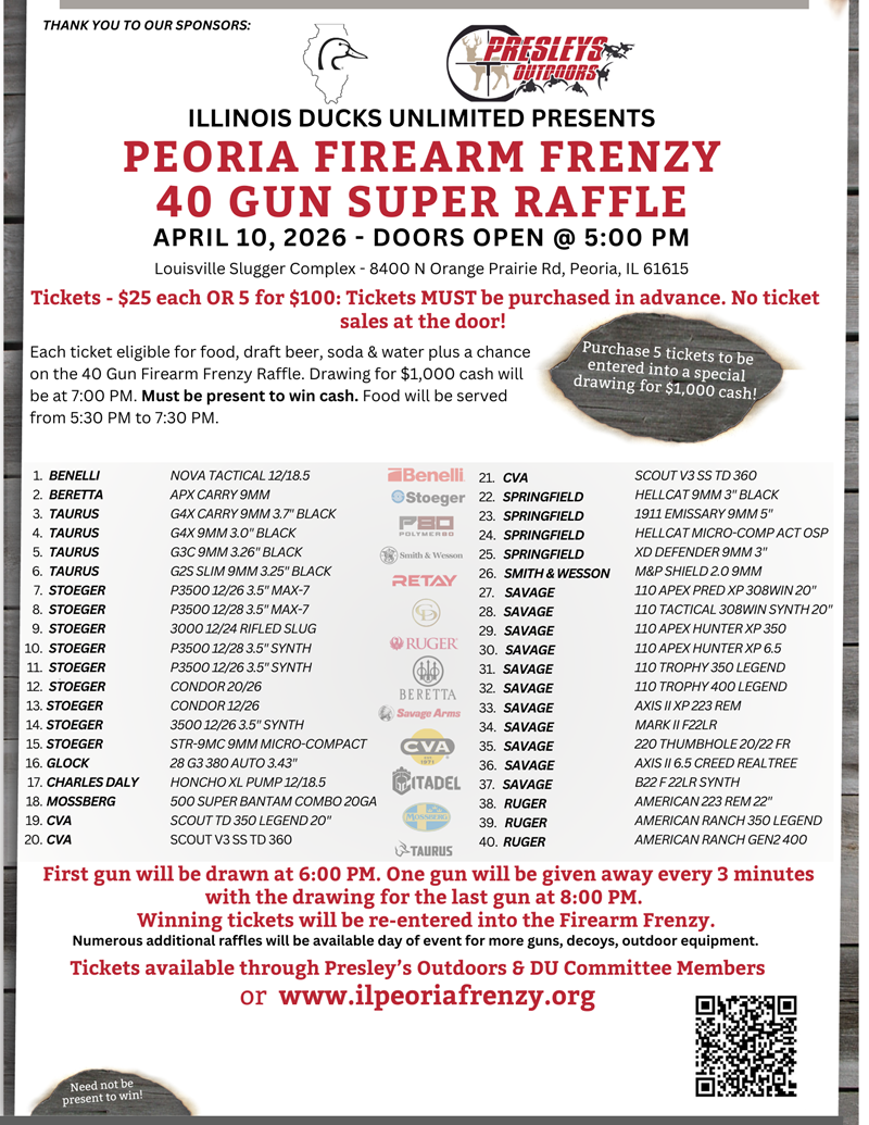 - All firearms will be handled and transferred through Presleys Outdoors in Bartonville