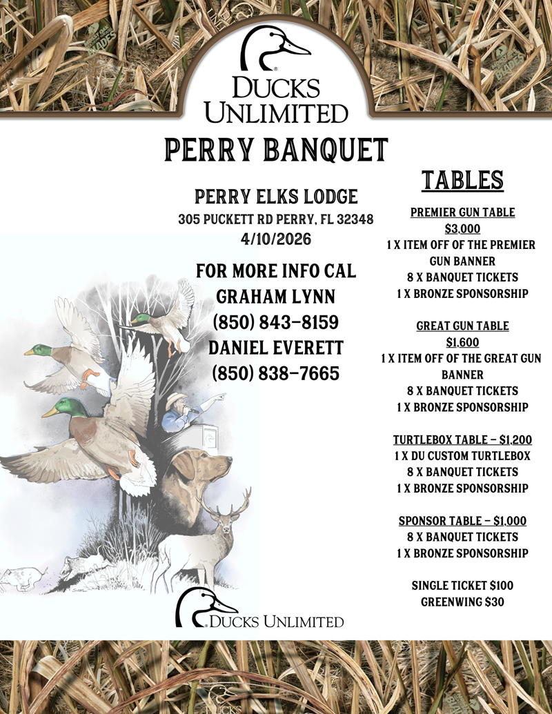 Come out Friday 4/10/2026 and enjoy Smoked Prime Rib and Grilled Shrimp, and bid on some unique Ducks Unlimited merchandise. We will have more guns to raffle off than ever!