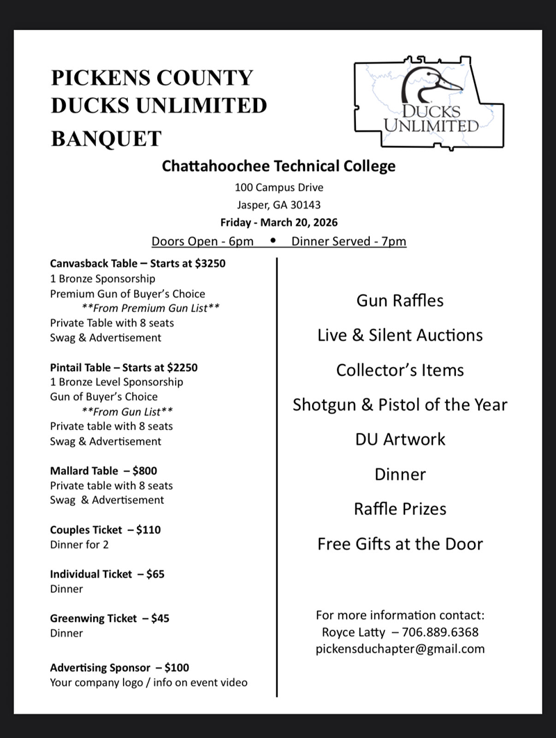 Contact Royce Latty at pickensduchapter@gmail.com or 706-889-6368 if you have any questions