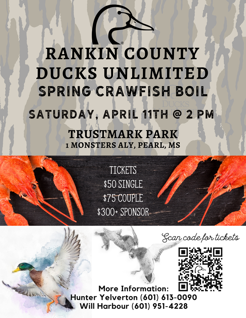 Join the Rankin County chapter of Ducks Unlimited as they hold a Crawfish Boil on Saturday, April 11th. This year's crawfish boil will be held at Trustmark Park in Pearl, MS. Doors will open at 2 pm. We will have crawfish, cold drinks, auctions, & raffles. Contact Hunter Yelverton (601) 613-0090 or Will Harbour (601) 951-4228 for more details. We look forward to seeing you there!