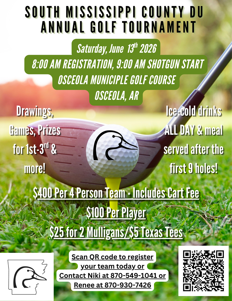 For more information on the tournament, or to become a volunteer on the South Mississippi County DU chapter, please contact Renee at 870-930-7426 or Niki at 870-549-1041.