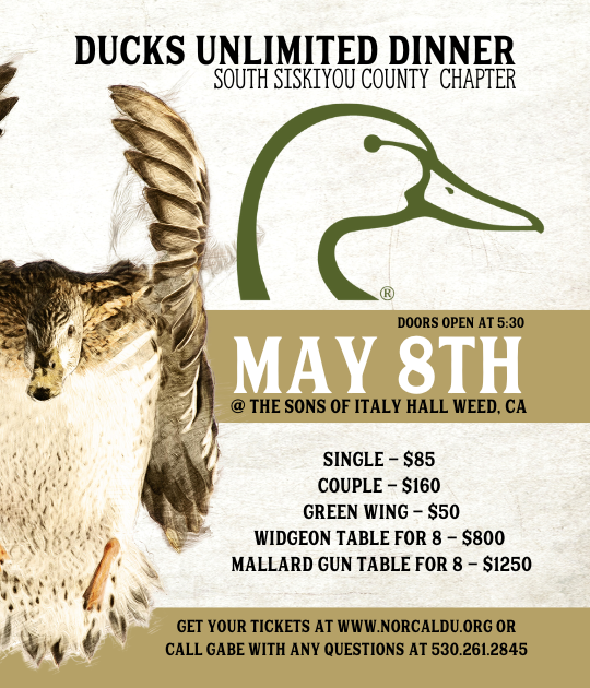 We would like to invite you to our 2026 Ducks Unlimited banquet in Weed California. Get your tickets today as they will sell out!