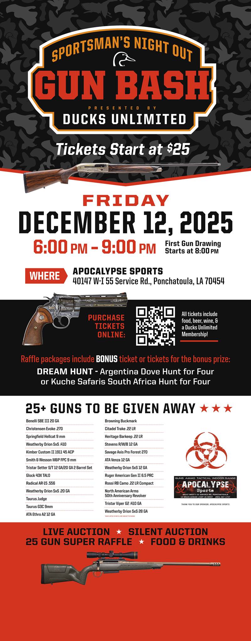 Live Auction, Silent Auction, 25 Gun Raffle, Cocktails, Appetizers