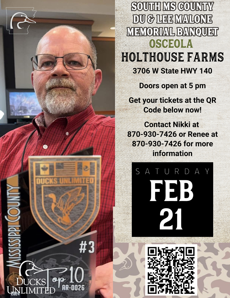 For more information on the event, or to find out how to join the South Mississippi County DU chapter, contact Niki at 870-549-1041 or Renee at 901-930-7426.