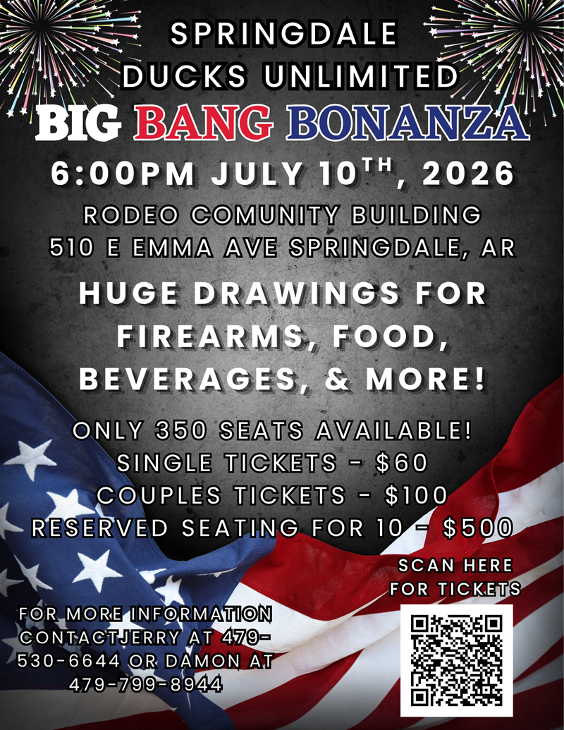 For more information about the event or to learn how to be a part of the Springdale DU Team, please contact Jerry at 479-530-6644, or Damon at 479-799-8944.