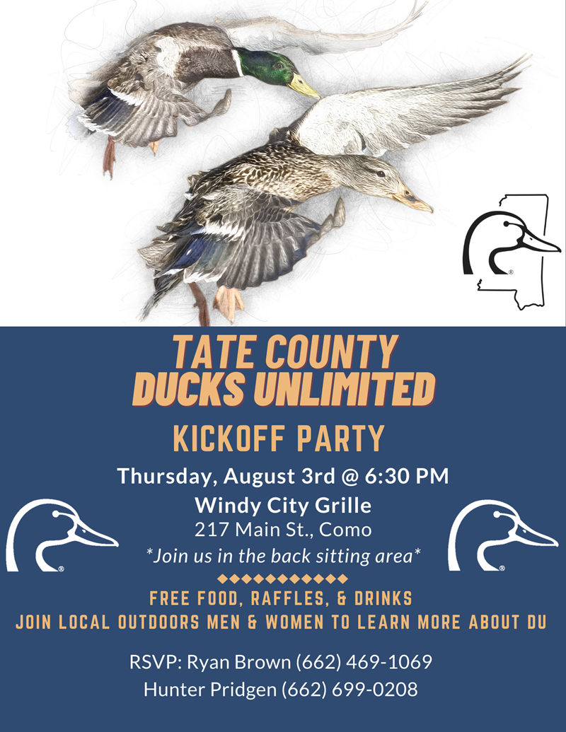 Join the Tate County Chapter of Ducks Unlimited as they host their Kickoff Meeting on Thursday, August 3rd at 6:30 pm. Our meeting is open to the public and food, drink, & raffles will be provided.