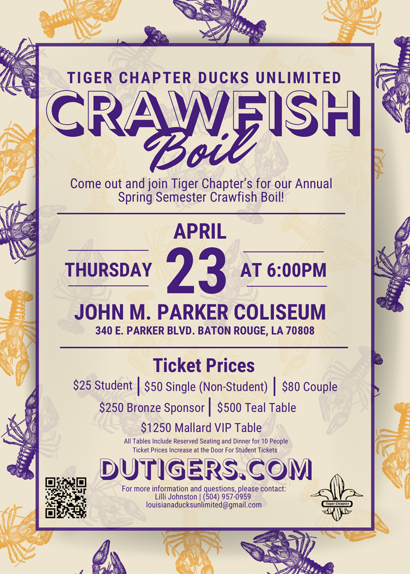 Make plans to join us for the Tiger Chapter Ducks Unlimited Crawfish Boil!!