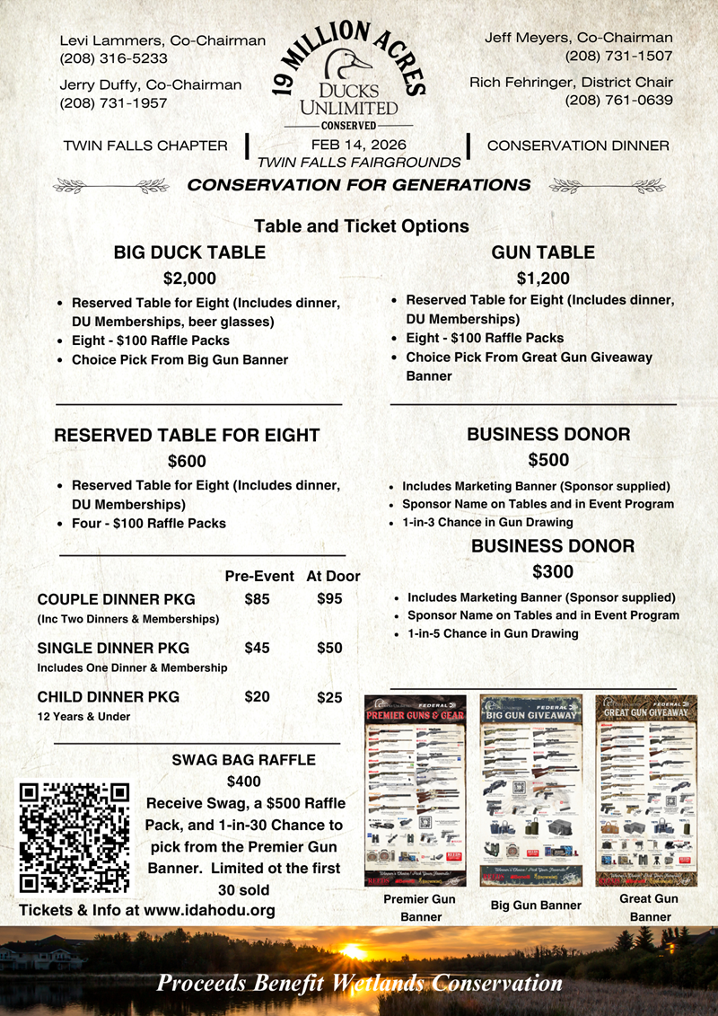 Your ticket includes a BBQ dinner and a $35 DU Membership. Tickets purchased by Feb 8th will be entered into the EARLY BIRD GUN DRAWING. Don't miss out on our limited SWAG BAG RAFFLE. Limited to the first 30 bags sold and they will sell out. For tickets click on the Tickets link above. For questions call Levi at (208) 316-5233. Ticket prices will increase day of event if this event is not already sold out, so don't wait to get your tickets. Ticket and table details below.